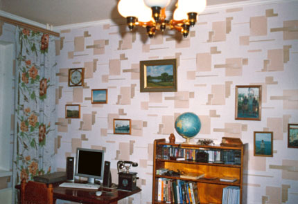 Колерованный потолок, белый плинтус, виниловые обои на ровных стенах – основа для декорирования интерьера.